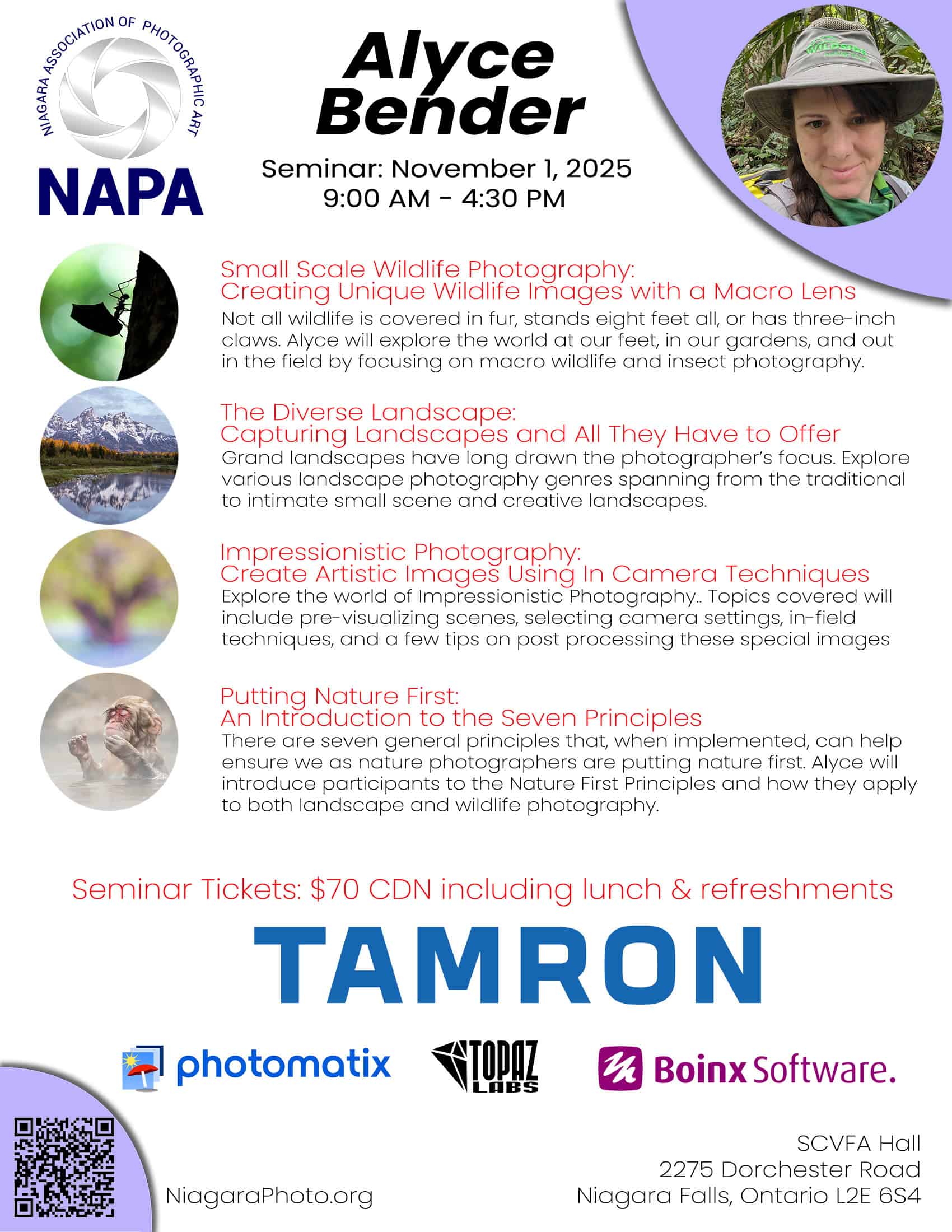 Alyce Bender (Tamron Ambassador) will be the guest speaker and will be providing 4 subjects throughout the day.